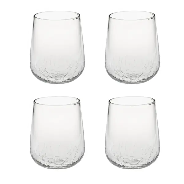 Tumbler in vetro trasparente, soffiato a bocca. Base arrotondata con lavorazione effetto crackle esaltano i giochi di luce del vetro e creano l’illusione di un “centrino” a sottobicchiere sulla tavola.