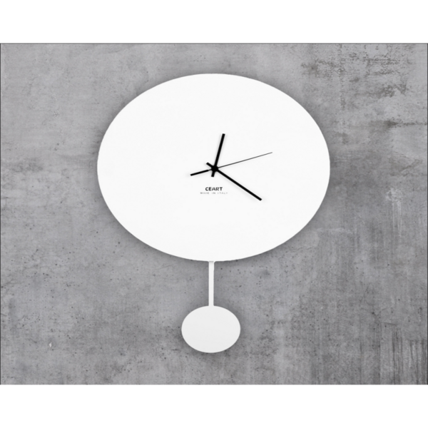 Orologio da parete con movimento a pendolo dalle linee pulite ed essenziali.